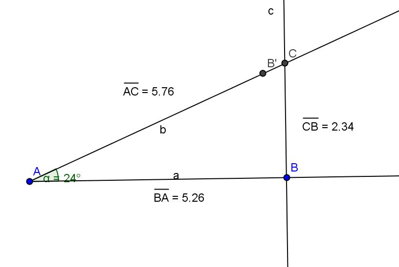 Erzeuge nun eine Senkrechte durch B zu dem Strahl durch A und B. Der Schnittpunkt dieser Senkrechten und des Strahls von A durch B' sei der neue Punkt C.