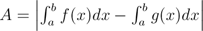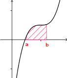 Zunächst müssen die Schnittpunkte der beiden Kurven bestimmt werden (f(x)=g(x) ). Dann bestimmt man (wenn nötig) nacheinander jeweils die Flächen zwischen zwei benachbarten Schnittpunkten (hier a und b), wie folgt: oder Wenn man sich sicher ist, dass f(x) in diesem Intervall von a bis b oberhalb von g(x) liegt, kann man die Betragsstriche auch weglassen. |