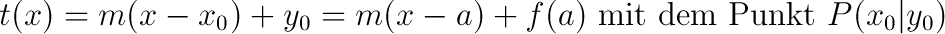 Zunächst bestimmt man den Punkt an dieser Stelle durch einsetzen in die Funktion: P(a|f(a) Dann bestimmt man die Steigung: m=f'(a) Dies setzt man in die allgemeine Geradengleichung y=mx+b ein (für y=f(a), m=f'(a), x=a) und bestimmt b. Mit den Werten m und b kann man die Geradengleichung angeben. Alternativ kann man Punkt und Steigung auch direkt in die Punkt-Steigungsform der Geraden einsetzen: ![]() |