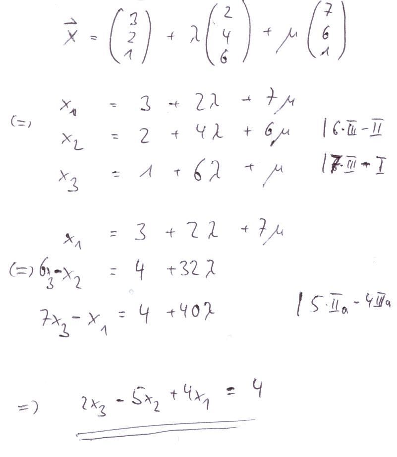 Man schreibt jede Koordinate in eine eigene Zeile und entfernt durch das Additionsverfahren (wie beim Gaußverfahren) die beiden Parameter aus einer Zeile: ![]() |