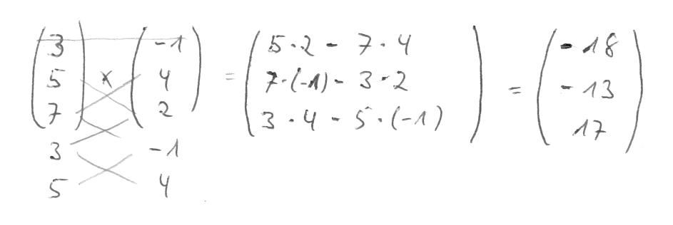 Der Vektor der sich als Kreuzprodukt ergibt steht senkrecht auf den beiden Ausgangsvektoren. (z.B. als Normalenvektor) Seine Länge/Betrag entspricht der Fläche des aufgespannten Parallelogramms. |