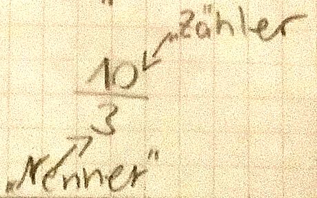 Der Zähler steht über dem Bruchstrich, der Nenner darunter. \(\frac{\text{Zähler}}{\text{Nenner}}\) |