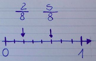 Der Bruch \(\frac14\) entspricht einem Viertel der Länge von 1, d.h. man betrachtet die Strecke von 0 bis 1 und teilt sie in vier gleich große Stücke. \(\frac14\)liegt genau zwischen dem ersten und dem zweiten Stück. ![]() | Man erweitert oder kürzt sie so, dass die Nenner (unten) gleich sind. Dann ist der Bruch mit dem größeren Zähler größer. Im Beispiel erweitert man z.B. auf 40 = 5·8 \(\frac{3}{5}=\frac{24}{40}\) und \(\frac{5}{8}=\frac{25}{40}\) also ist \(\frac{5}{8}\) der größere Bruch, da 25 Vierzigstel mehr sind als 24 Vierzigstel. | Man muss von 0-1 (auf dem Zahlenstrahl) in 5 Teile teilen. So weiß man, wie groß \(\frac15\) ist. Da man \(\frac25\) einzeichnen muss, zeichnet man sie beim Ende von zwei Strichen die so groß wie \(\frac15\) sind ein. |
