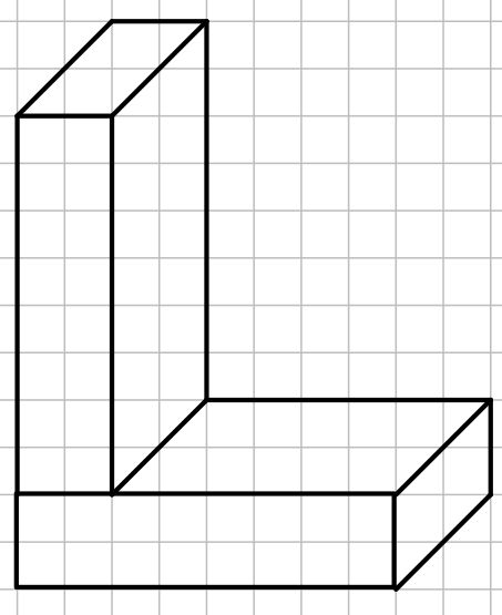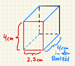 Zähler (oben) und Nenner (unten) ![]() | ![]() Man zeichnet die Vorderseite in den gegebenen Längen und für die schräg nach hinten verlaufenden Linien zeichnet man für 1cm in der Realität eine Kästchendiagonale in das Bild. |